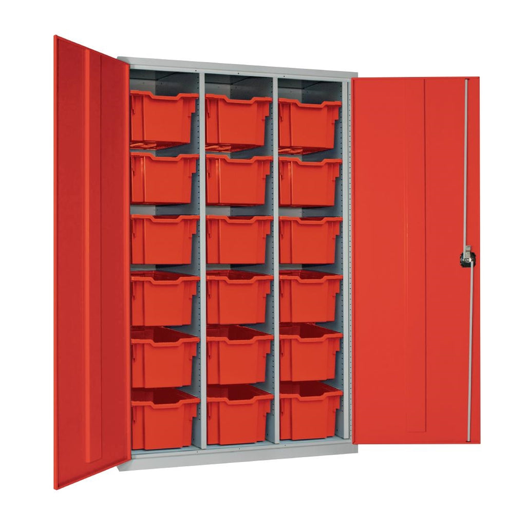 Standing 1830mm tall, the cupboard ensures safe storage with its 3-point locking system. A steel construction with red powder-coated doors makes it durable, resistant to wear and suitable for diverse settings. This model comes supplied with 18 deep trays (225(H)x312(W)x418(D)mm) in a three-column configuration.