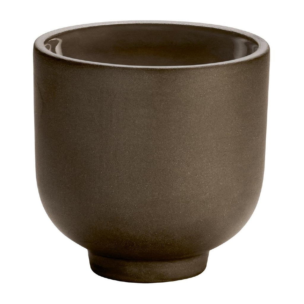 These ReNew handleless cups feature a smooth matte finish on the exterior, showcasing the pure, earthy tones of natural clay. This smooth finish is beautifully contrasted by a durable shiny brown glaze on the interior, creating a sophisticated serving solution.