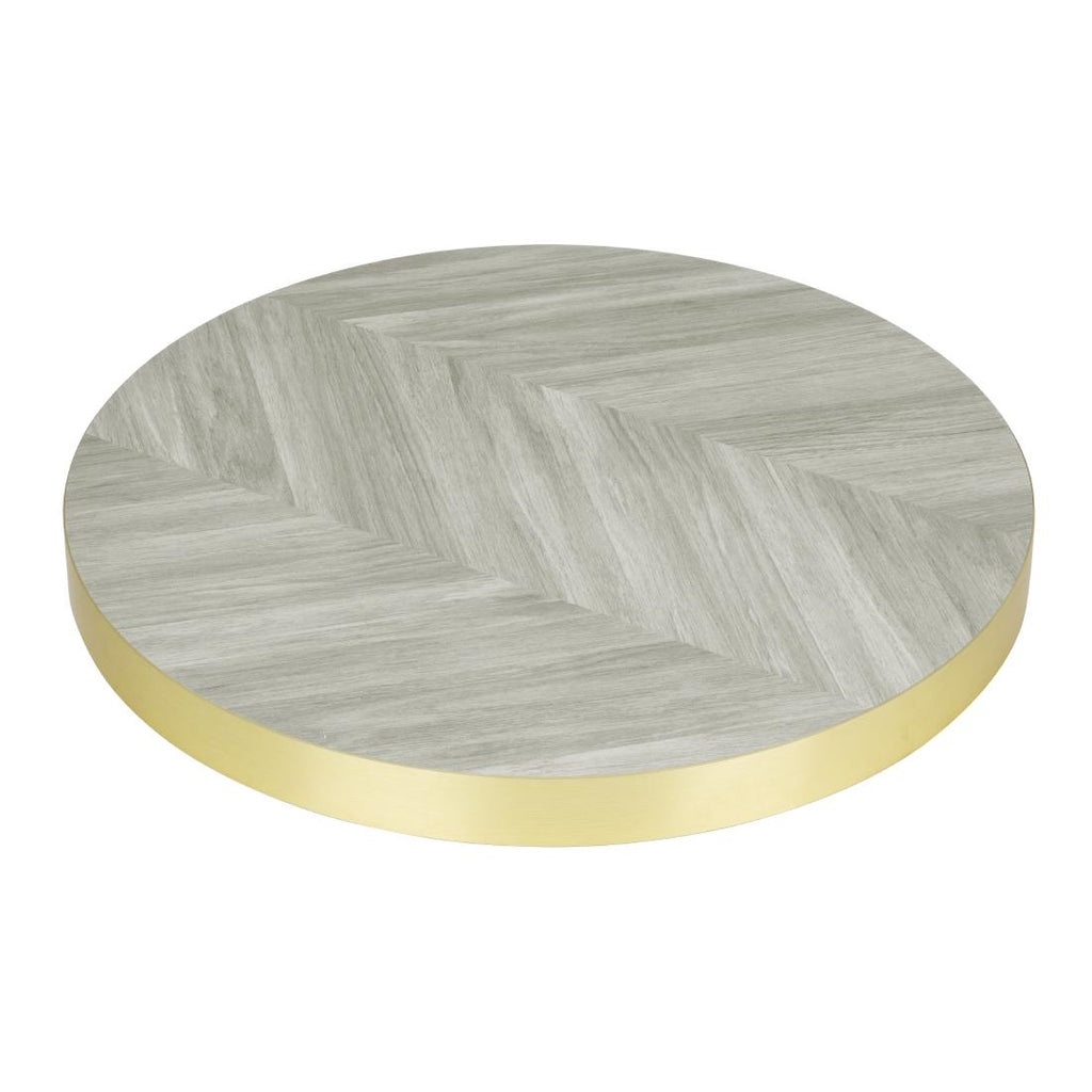 48(H)x600(Ø)mm With its vibrant chevron print and gold edge finish, this round table top from Bolero is perfect for any commercial hospitality, office or café setting. The tabletop comes supplied...