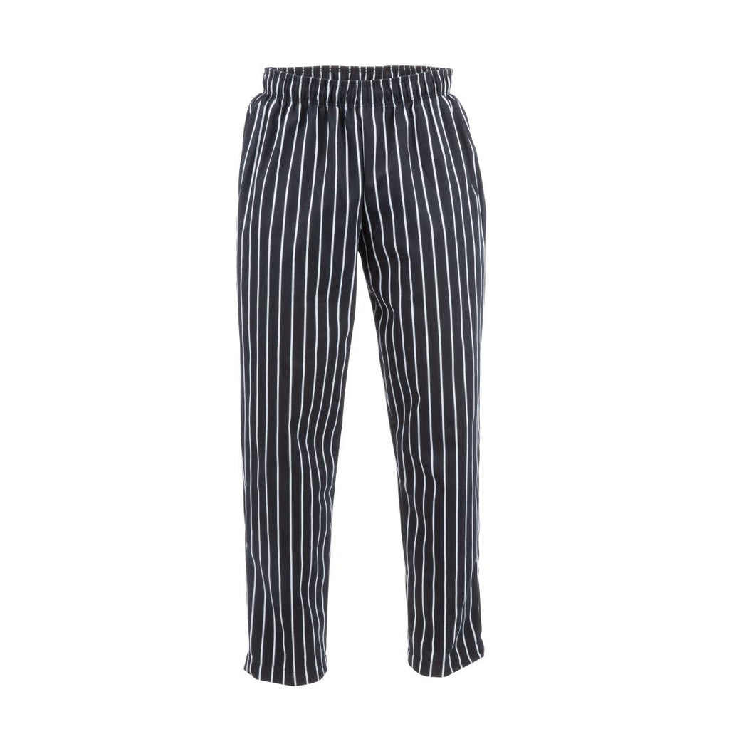 M. Waist Size: 34"-36" Traditionally designed trousers for all day comfort in the kitchen. Easy laundering with no buttons to break. Long leg can be rolled up to fit. Teflon-coated polycotton version available for extra protection from spillage.
