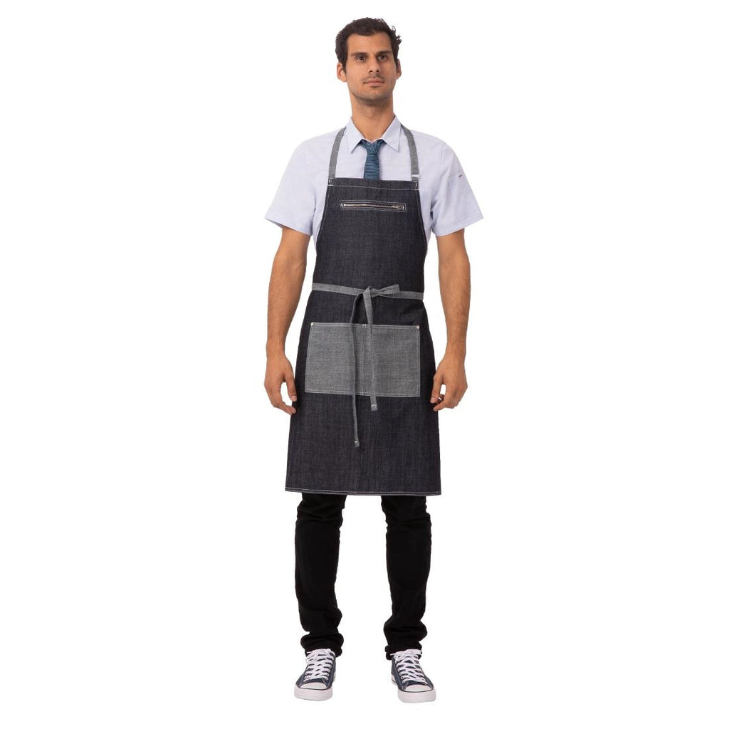 Colour: Blue. Material: 100% cotton demin. Measurements: 760(W) x 865(L)mm Stay organised and maintain a stylish appearance with the Chef Works Manhattan Bib Apron, featuring a zip chest pocket for...