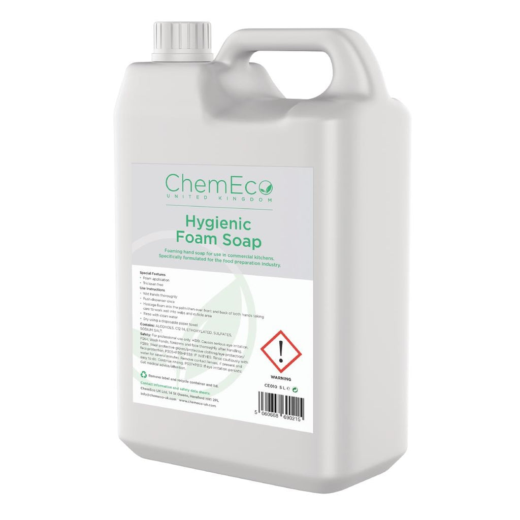 Pack Quantity: 1x5Ltr ChemEco Hygienic Foam Soap is made to a high ecological specification, the gentle formulation is safe and effective at removing soil and harmful pathogens from your hands. Ideal for regular and repetitive use. Highly economical when used through the ChemEco Foam Soap dispenser.
