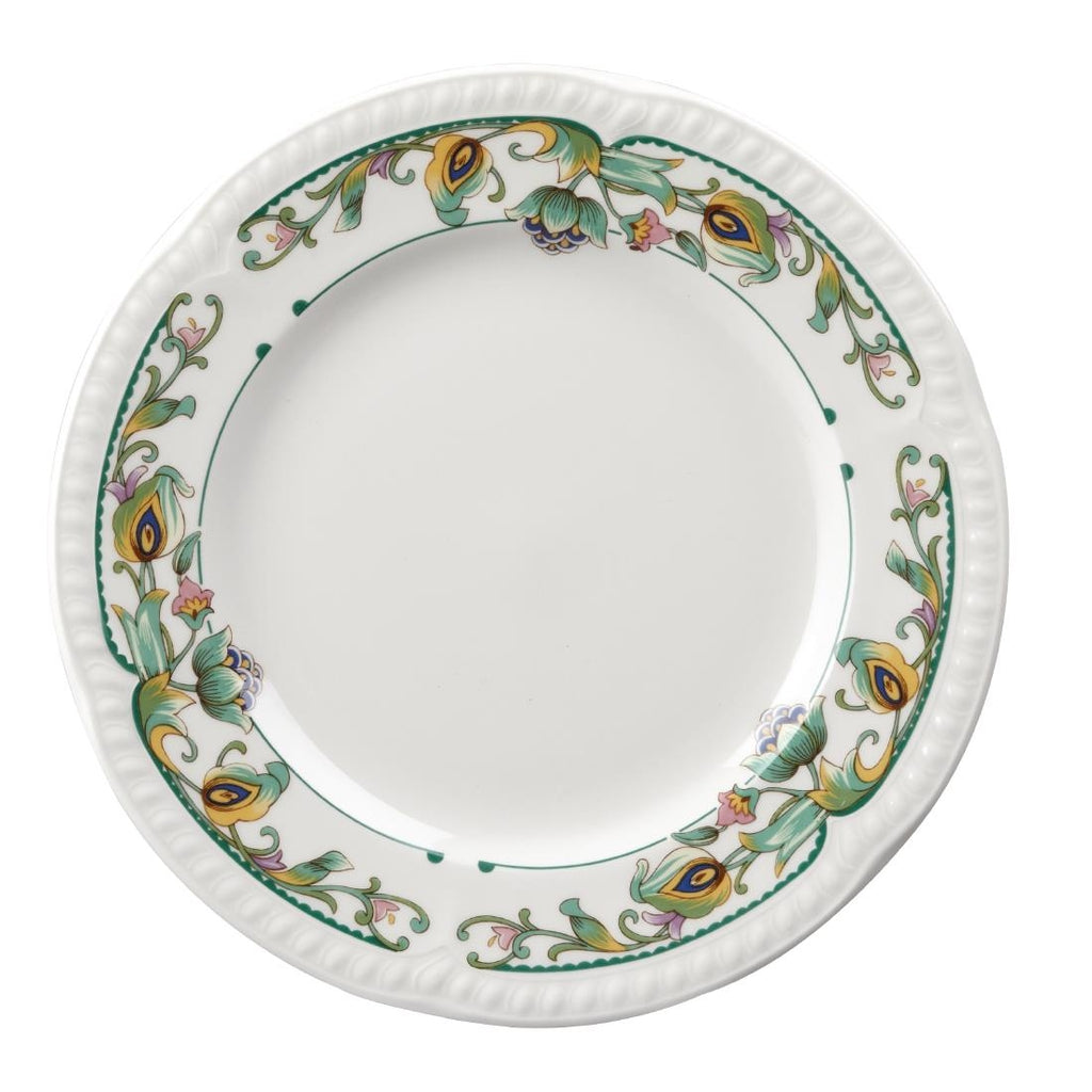 215(Ø)mm/ 8 1/2". Tropical. Pack quantity: 24. Elegant printed plates by Churchill with a tropical floral design featuring the delicate embossment of the Buckingham shape, featuring a durable glaze which provides an ultra smooth surface for presentation.