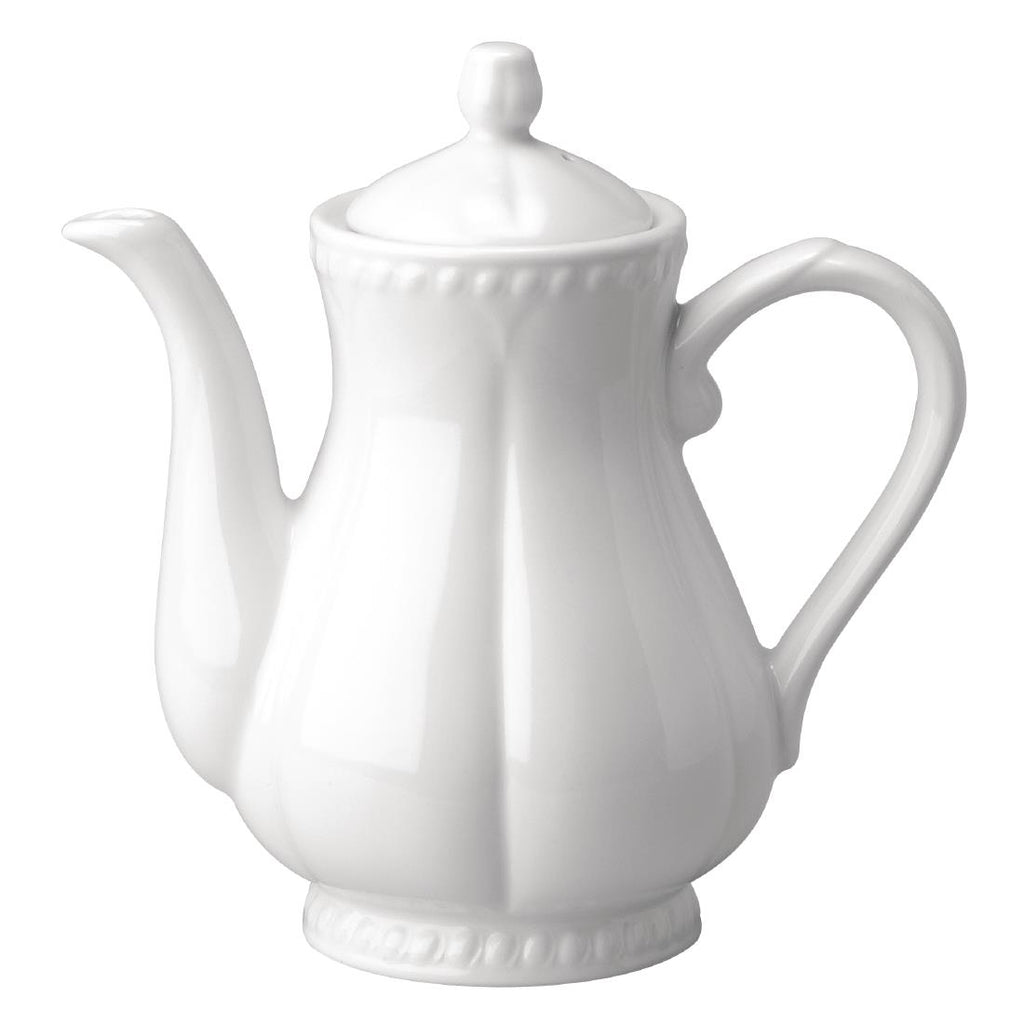 2pt. White Pack quantity: 4. Buckingham white coffee pots have a distinctive rope embossed Gadroon edge and subtle fluting, perfect for any catering establishment looking for a more traditional style of tableware. Its super vitrified body has a high resistance to thermal shock which helps reduce breakages.