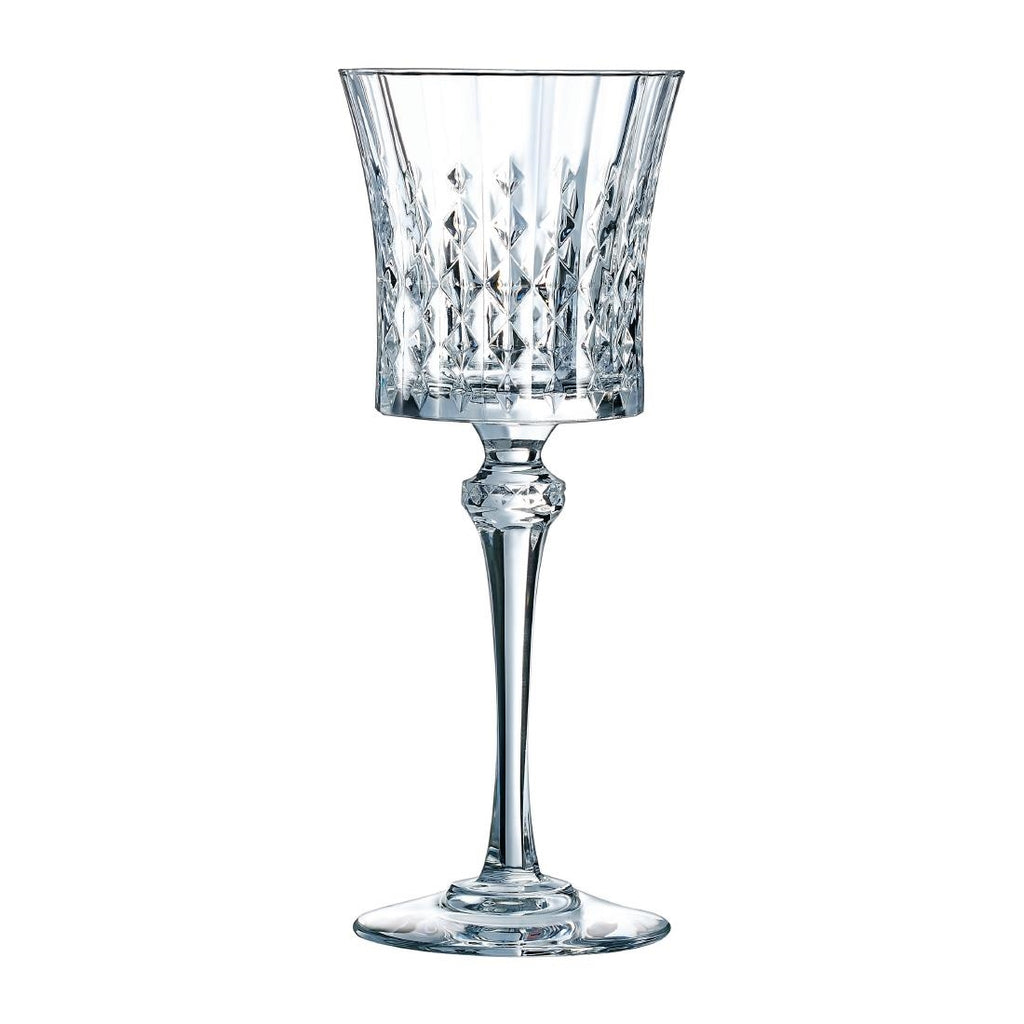 190ml/6.7oz. Pack Quantity: 12 Bring a touch of glamour to your drinks service with these 190ml wine glasses from the Lady Diamond collection by Cristal d'Arques. The cut-glass design shimmers as it catches the light, adding a touch of elegance to any table setting. Crafted from Diamax lead-free crystal glass, these Lady Diamond wine glasses are built to last. They offer superior strength, exceptional transparency, and long-lasting brilliance, ensuring your beverages are showcased in style.