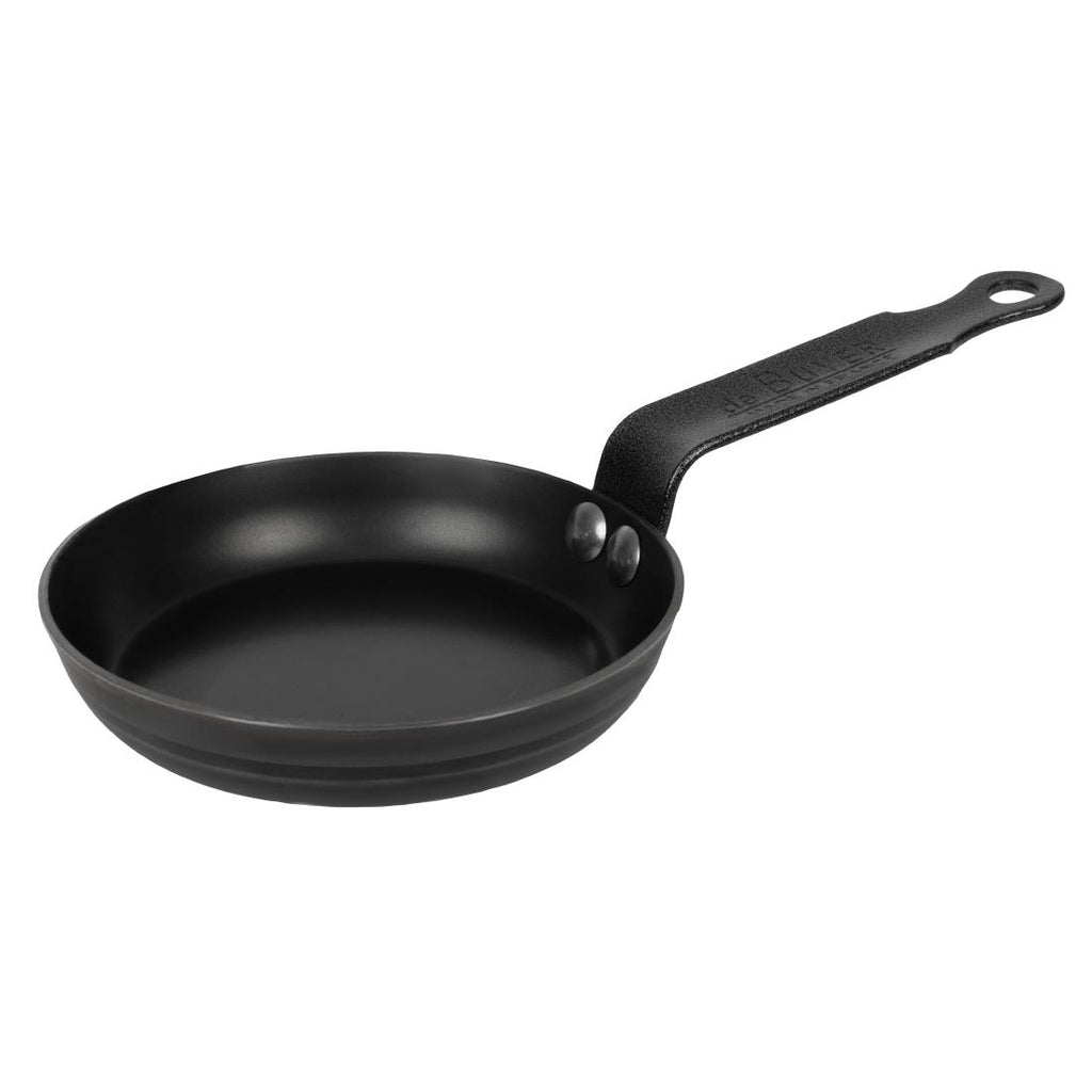 Size: 120(Ø)mm. Material: Blue Steel Create the perfect Blinis with the De Buyer black iron steel blinis pan. Made from heavy-duty blued iron, this pan distributes heat to cook food evenly - giving each blini a crisp and consistent finish. Plus, the commercial-quality build provides excellent durability to ensure the pan handles everyday use in professional kitchens with ease.