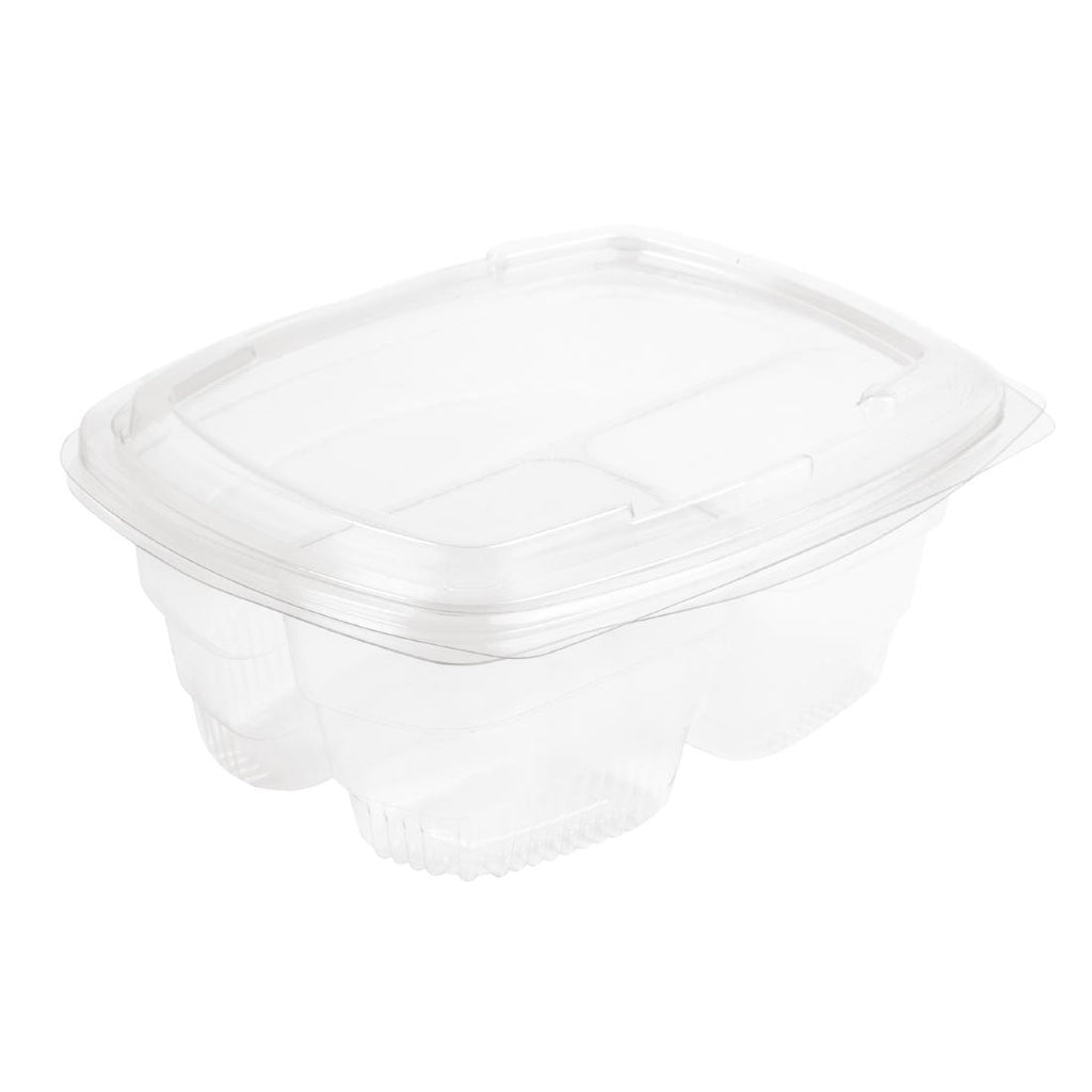 Pack Quantity: 300 A pack of 300 x stylish, three-compartment deli containers made from recycled plastic. These containers are fully recyclable after use.