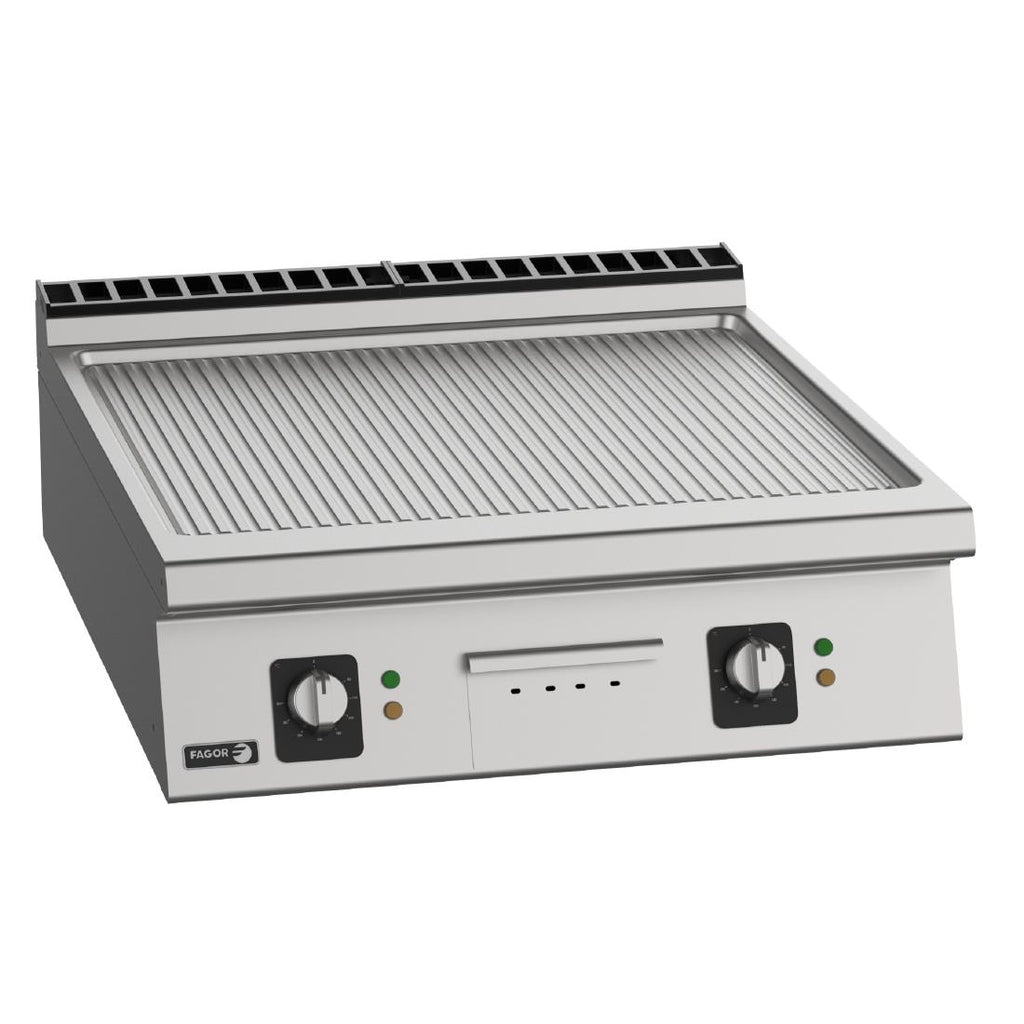 15kW. 3 Phase Powerful and reliable, the FT-E910 LR Fagor 900 Series countertop half ribbed plate electric griddle provides the perfect cooking surface for busy professional kitchens. Providing an impressive 15kW of power across its 800mm wide, 20mm thick mild steel half ribbed cooking plate, you get a fast heat-up and rapid recovery times - essential for those busy lunch or dinner hours.