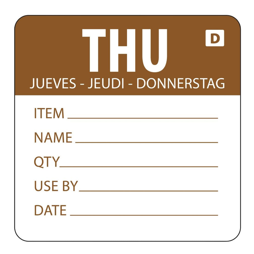 Thursday. Roll of 250 Dissolvable colour coded food safety labels to work alongside days of the week rotation systems. Roll of 250.