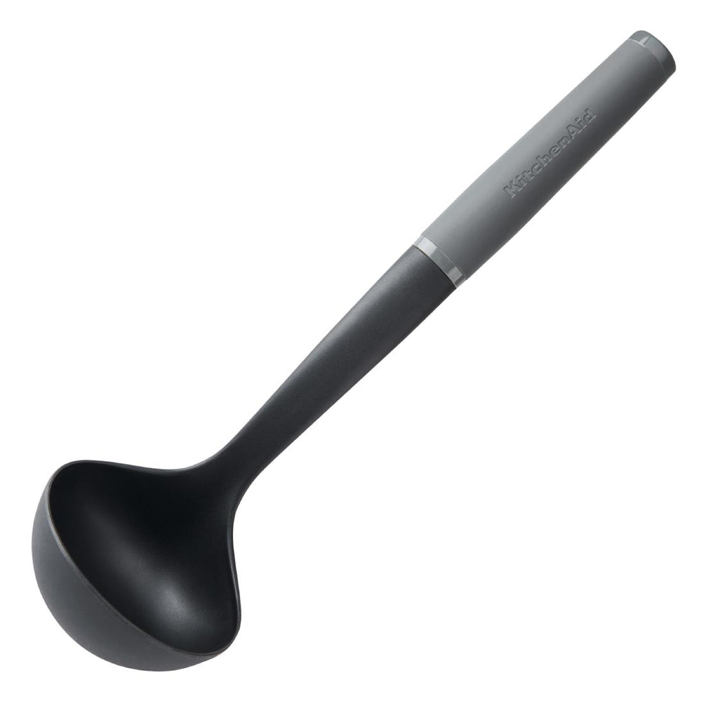 KAS006OHCGG. 315mm The KitchenAid ladle is ideal for serving up gravies, soups, stews, dressings, and sauces. This strong, durable ladle is safe to use on all cookware, including non-stick, and is heat resistant to 232°C/450°F. The soft grip handle features a debossed logo, and it's also dishwasher-safe for easy cleanup. A superb ladle for everyday use.