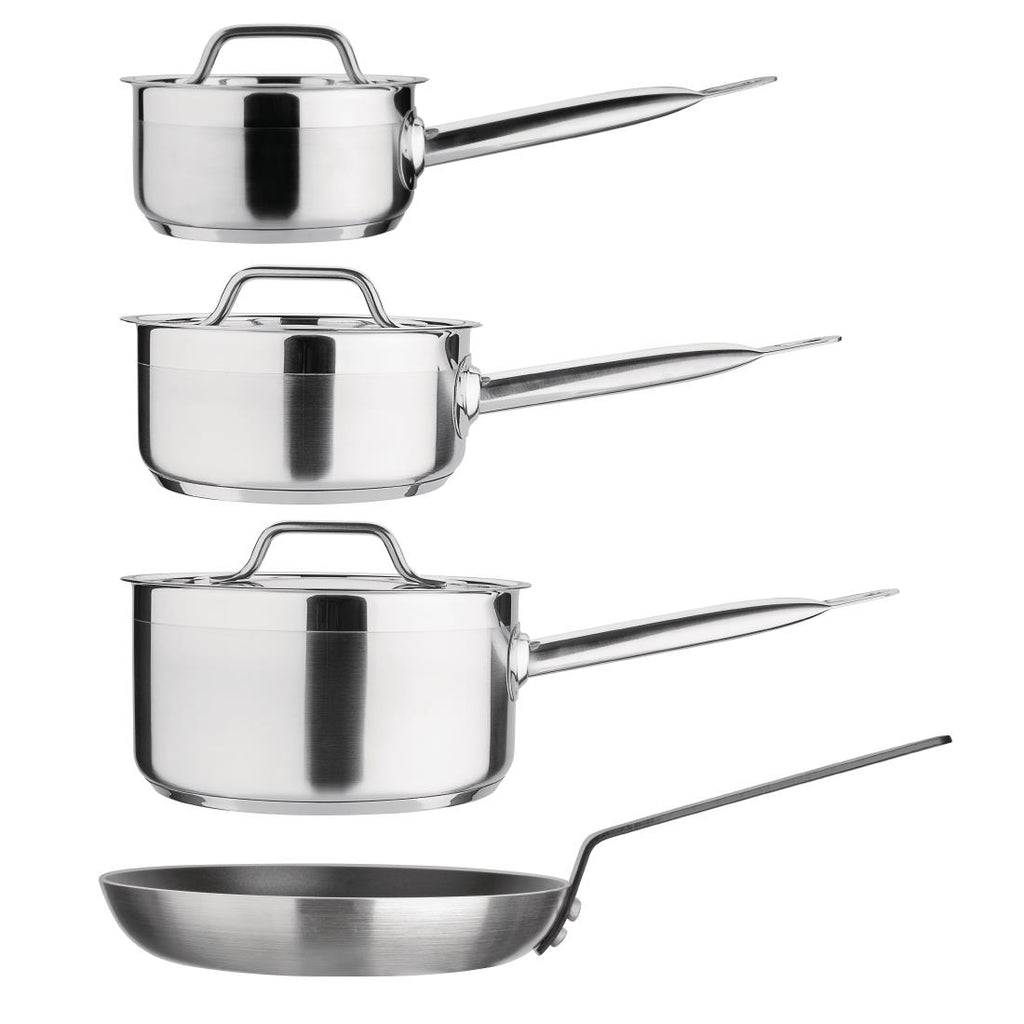 Contains: 1 x Nisbets Essentials Stainless Steel 900ml Saucepan & Lid, 1.5Ltr Saucepan & Lid, 3Ltr Saucepan & Lid and 240(Ø)mm Non-Stick Frying Pan Want to overhaul your cookware collection...