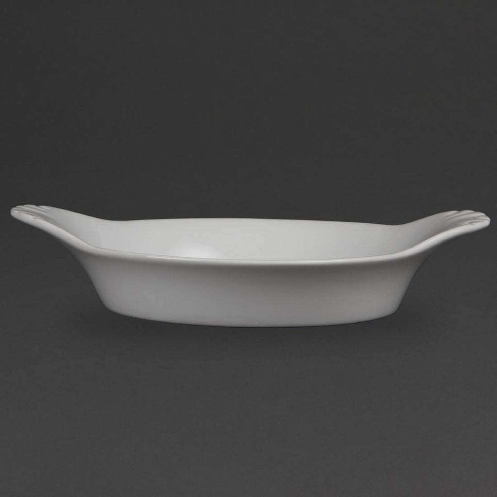 47(H)x 220(W)x 177(D)mm. White. Pack quantity: 6. This pure white, round eared dish from Olympia is designed to provide a great value and hardwearing porcelain crockery solution for busy hotels, canteens, casual dining restaurants and cafes. Strengthened rolled edges ensure the dish is chip resistant and the fully vitrified body gives great glaze durability, making it ideal to withstand the rigours of the professional catering environment. The dish is stackable, helping maximise storage space, and oven, microwave, dishwasher and freezer proof.
