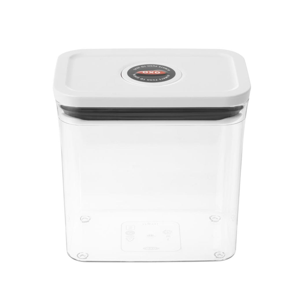 Capacity: 1.6Ltr Keep dry foods fresh and organised in your kitchen with this short rectangular POP container from OXO. Designed with convenience in mind, the 1.6-litre container is fitted with a silicone seal that becomes airtight at the touch of a button while releasing a satisfying `pop' sound. This innovative seal also makes it possible to open and close the container with just one hand.