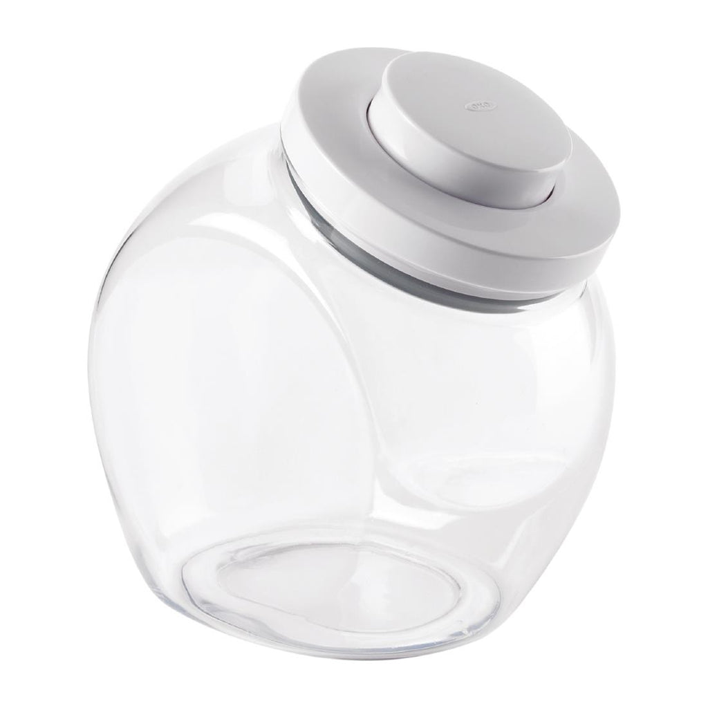 Capacity: 2.8Ltr Ideal for storage of biscuits, cookies and other dry consumables the Oxo POP jar features an airtight seal which activates at the touch of a button. The button also acts as a handle, which allows you to remove the lid with a single hand for convenience. The jar is also designed with a flat back which means it can sit flush against a wall to maximise your space.