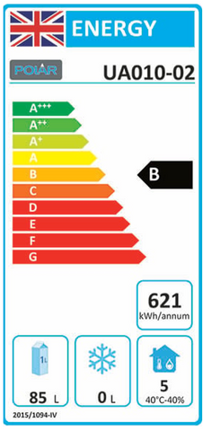160W. Net usable capacity: 91Ltr. R600a The Polar U-Series undercounter refrigerator is a superb solution for high demand kitchens where there's limited space. Designed for performance and reliability, the fridge offers a generous 91 litres of storage across two adjustable shelves, whilst also providing accurate temperature control via a user-friendly digital control panel.