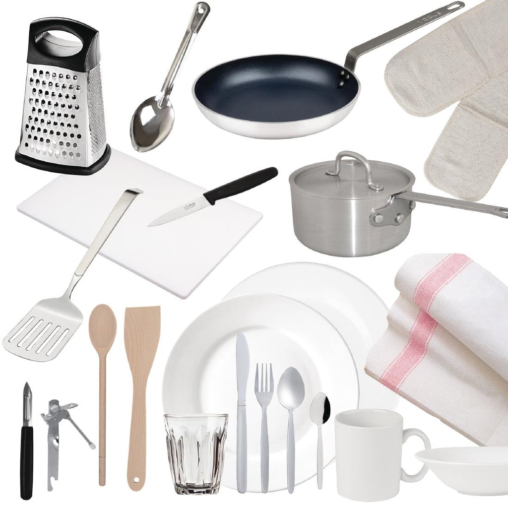 23 piece set Student accommodation kitchen packs available in three pack types to suit all budget levels, from Basic to Standard and the Full-Works. If you wish to add extra items to your Student Kitchen Pack order, call our Managed Accounts team on 0845 111 0284 and ask for details on our reduced fixed price list.