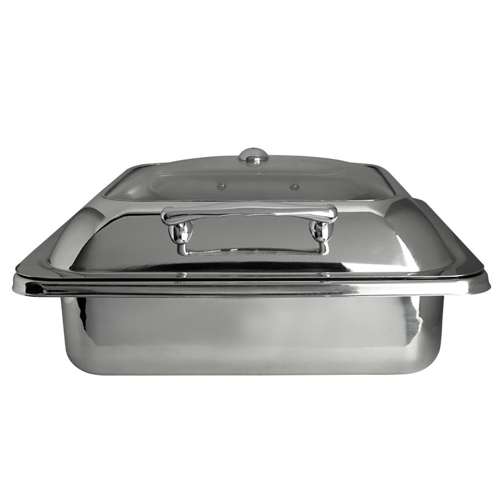 5.7Ltr/200oz. 175(H)x432(W)x390(D)mm. Pack Quantity: 24 Elevate your buffet presentation with these square hydraulic chafing dishes from Steelite's Creations collection. Featuring a large glass window in the lid, these chafers allow guests to see your delicious offerings without needing to lift the cover frequently. This not only keeps food at perfect serving temperatures but also helps maintain hygiene during service. Additionally, the easy-to remove hydraulic lid closes on its own to ensure that food is kept safe and covered during service, and the entire unit is induction compatible for maximum versatility.