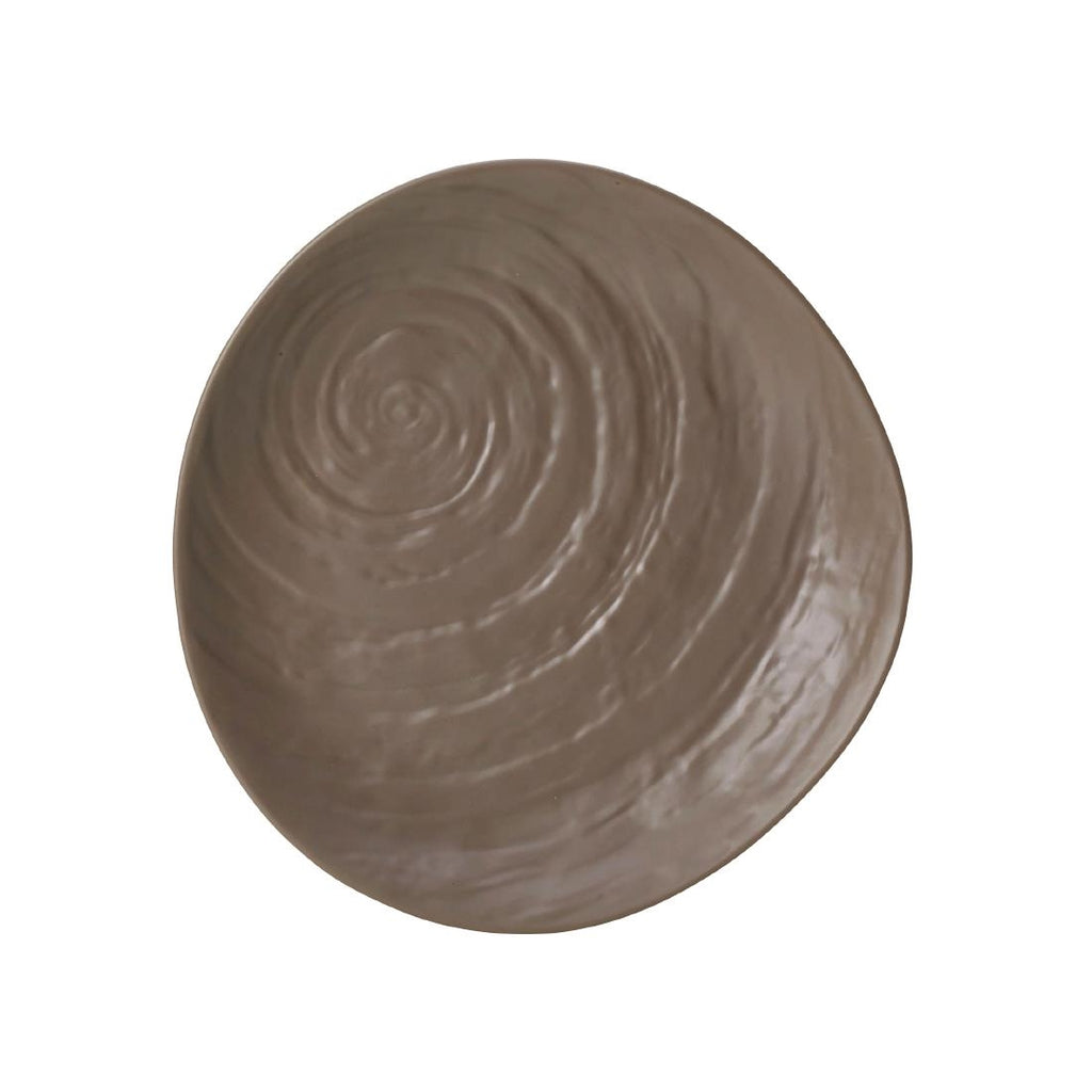 Plate These darker, mushroom-toned melamine plates are fantastically suited for catering any outdoor event or buffet with style thanks to their supremely lightweight and strong construction. These large plates maximise the appearance of any food with a tasteful blend of texture which showcases the appeal of a meal rather than overshadowing it. Safe for use in microwaves and dishwashers, these plates feature the attractive asymmetrical styling which is typical of the extensive Steelite Scape range.