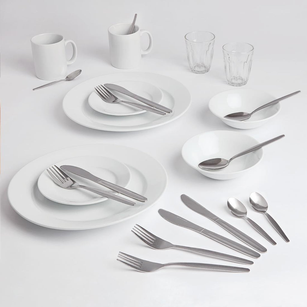 24 Piece Set Make sure you are fully prepared when moving into halls of residence, a student house or any other form of university accommodation, thanks to this affordable student accommodation crockery and cutlery set. Containing stainless steel Olympia Kelso knives, forks, teaspoons and dessert spoons, the cutlery within this student kitchen starter pack is incredibly durable and robust, allowing it to easily cope with the rigorous demands of university life. Boasting a super vitrified durable glaze and rolled edges, the included Athena Hotelware wide-rimmed dinner plates, side plates, cereal bowls and mugs are exceptionally strong and highly chip resistant, ensuring a long-lasting life in even the most hectic of student kitchens. 2 x 200ml Olympia toughened glass tumblers complete this student essentials pack, giving you everything you need to begin your new life at university at a remarkably reasonable price.