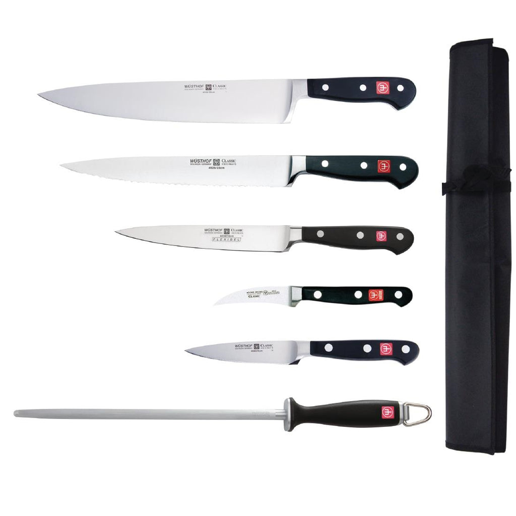 Carving Knife, Cooks Knife, Fillet Knife, Turning Knife, Paring Knife, Steel and Wallet This knife set includes 6 carefully chosen Wusthof knives which will be an asset to any professional chef. Supplied with a nylon wallet to protect and transport your knives.