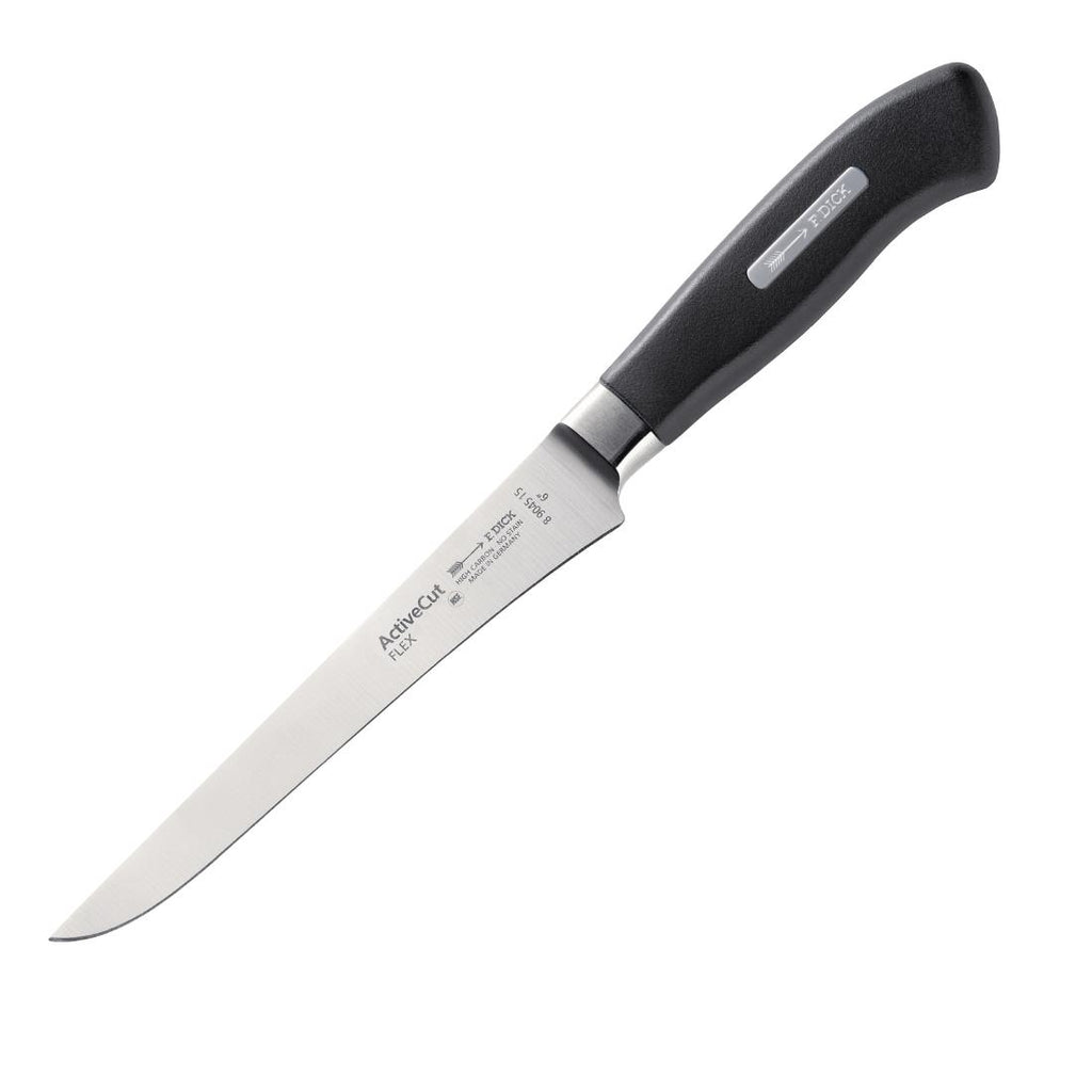 Blade Length: 6". Weight: 100g This flexible boning knife is part of the Active cut range from leading brand Dick. It features double honing to ensure extreme sharpness and its half-bolster allows you to sharpen the whole blade when required. The handle is ergonomically designed, providing you with comfort when working with large quantities. Its flexibility allows you to quickly and easily remove the bones from fish, poultry and other meats.