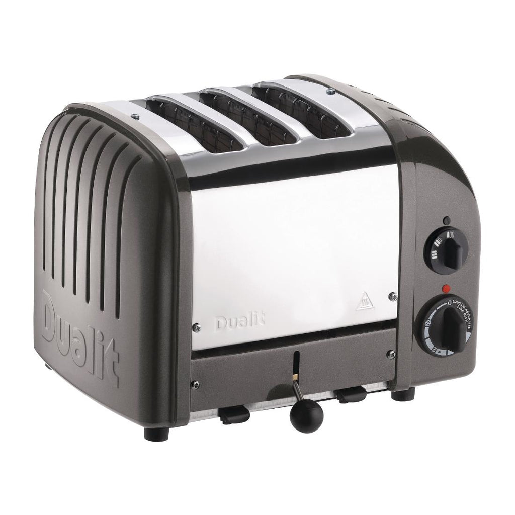 1.7kW. 3 Slots. Colour: Metallic charcoal Highly durable, practical and reliable, the Dualit 2 + 1 Combi Vario 3 Slice Toaster Metallic Charcoal offers the convenience and flexibility of both standard and sandwich toasters in a single unit. The toaster features extra wide 28mm slots to accommodate a thicker cut of bread and individual controls for each slot, saving money and energy in heating the slots only when required. It is easy to clean thanks to its hygienic stainless steel cover which, alongside the patented ProHeat elements, is replaceable, making the Dualit toaster incredibly long-lasting.