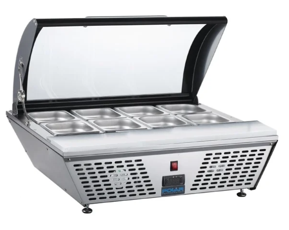 With a built-in chopping/prep board and stylish curved glass hinged lid, the servery unit reliably keeps up to 67 litres of food chilled over four 1/3-size GN pans (sold separately). The configuration can be adjusted according to your needs, allowing 1/6, 1/3 and 2/3 GN pans to be inserted - ideal for stocking larger amounts of more popular menu items. And thanks to its stylish design, the Polar is perfect for both front or back of house use, as well as self-service, assisted service or prep areas. Innovative improvements in energy efficiency throughout provides the Polar countertop display fridge with a reduced energy requirement, without impacting on performance.