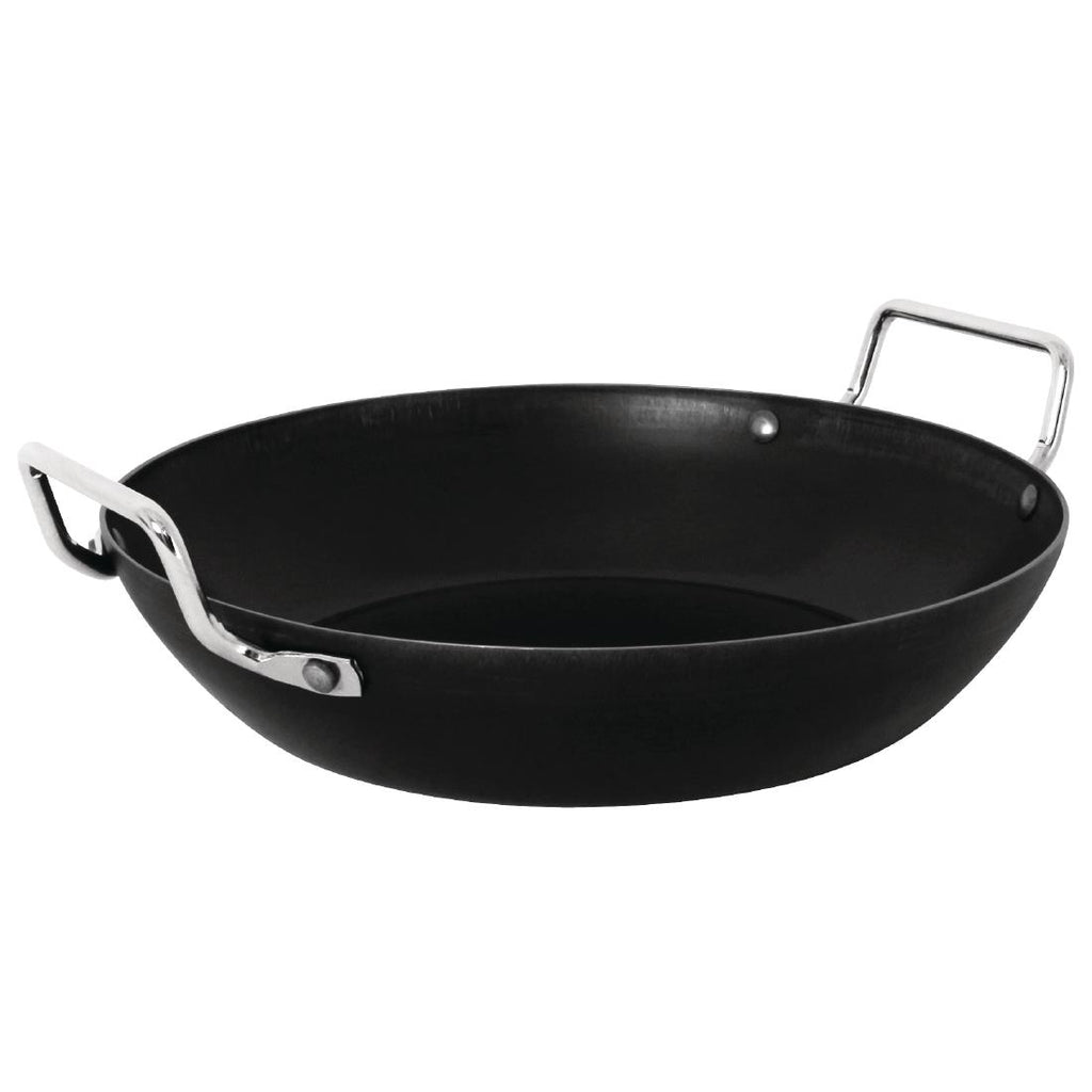 Size: 400(Ø)mm. Material: Carbon Steel Carbon steel is a perfect material for paella as it absorbs heat slowly and retains it over a long period of time. The heat is distributed evenly, creating the perfect dish. Pans must be seasoned before first use.