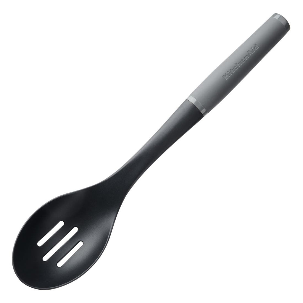KAS004OHCGG. 338mm Dip, pour, and scoop with the KitchenAid slotted spoon - featuring a large head that's ideal for lifting and draining foods. This strong, durable spoon is safe to use on all cookware, including non-stick and is heat resistant to 232°C/450°F. The soft-grip handle features a debossed logo, and it's also dishwasher-safe for easy cleanup. A superb spoon for everyday use.